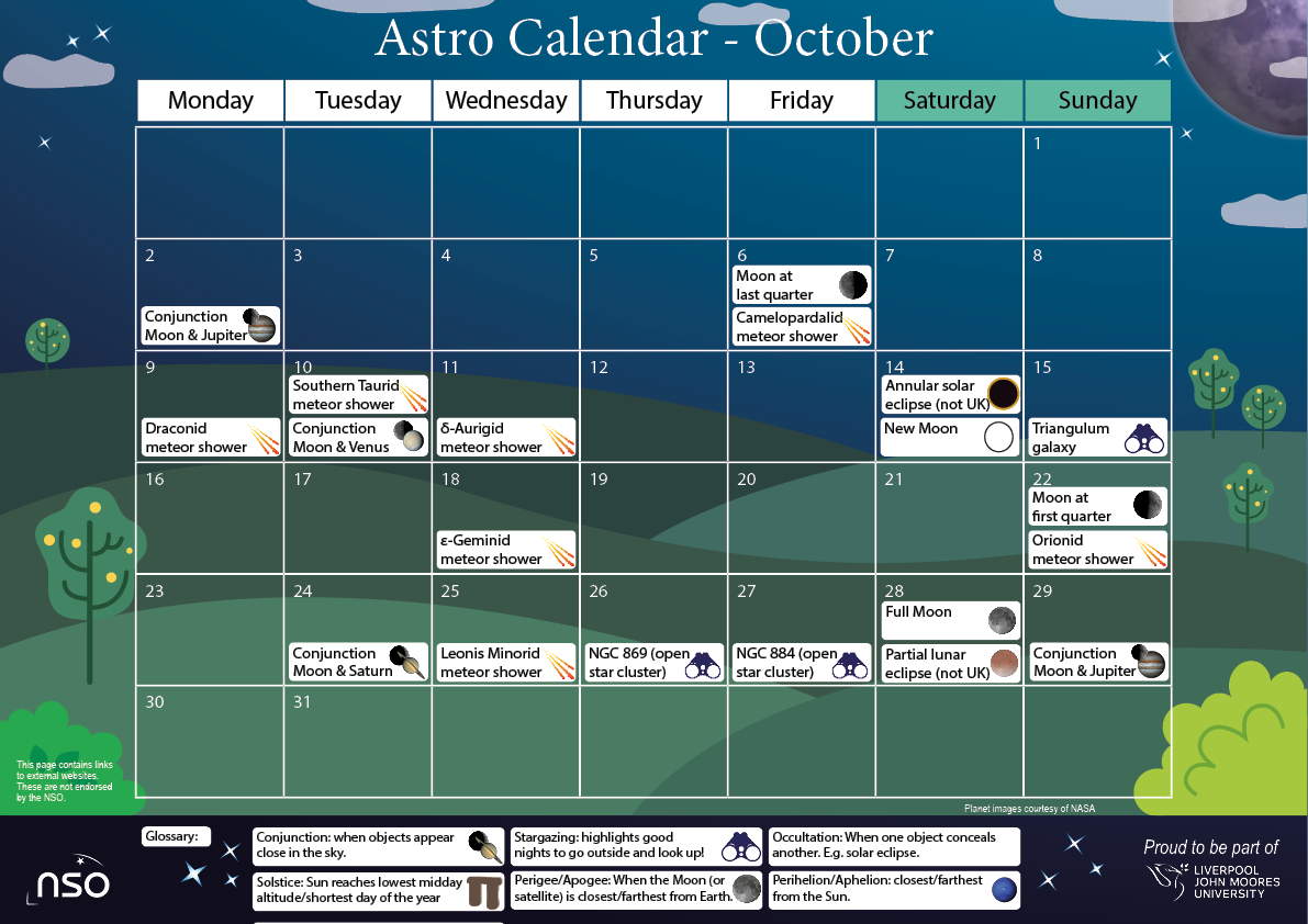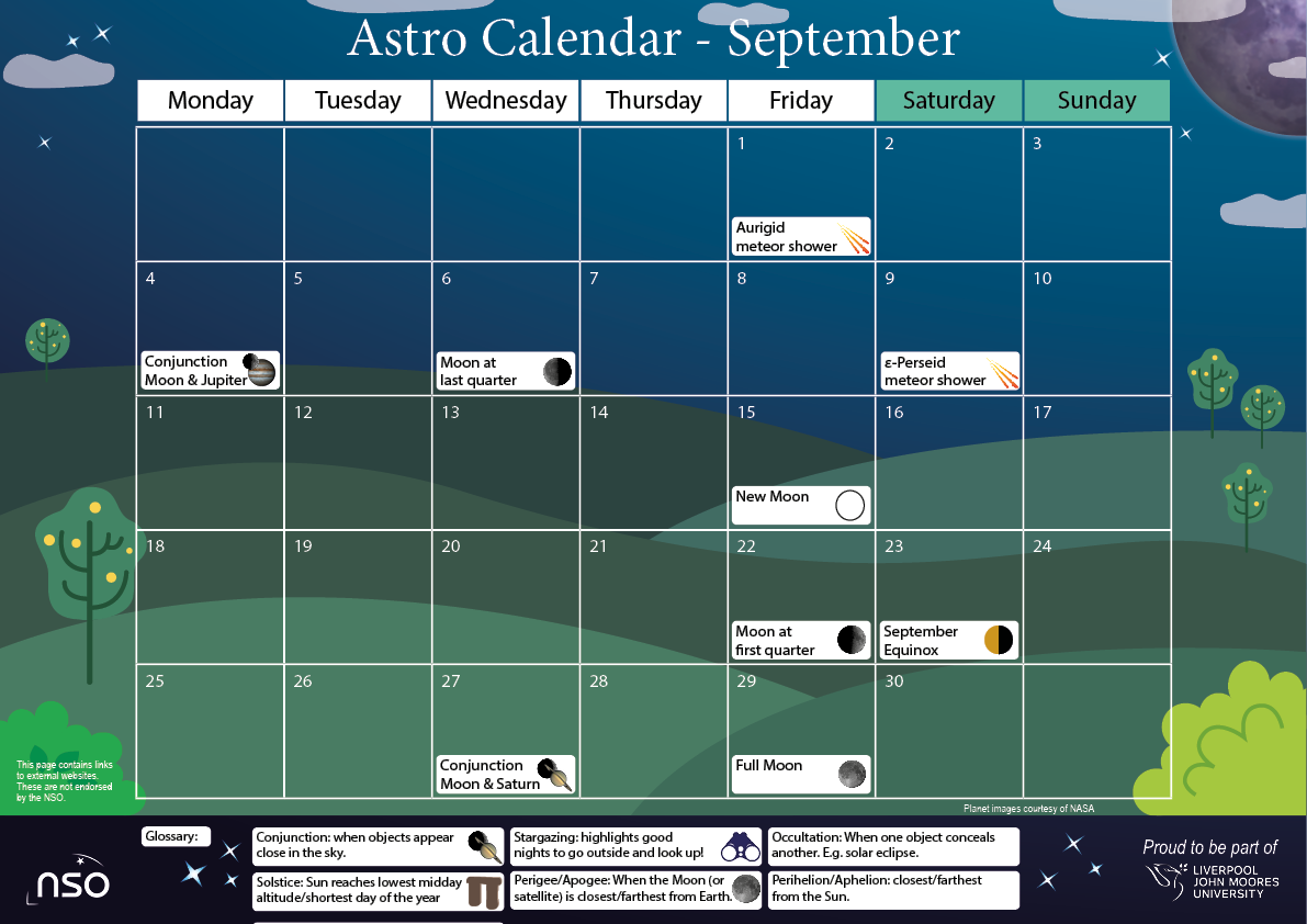 Discover more about the events using the weblinks in the PDFs. Click on the images below to load the PDF versions. Please note these calendars are based on views of the sky from the UK.